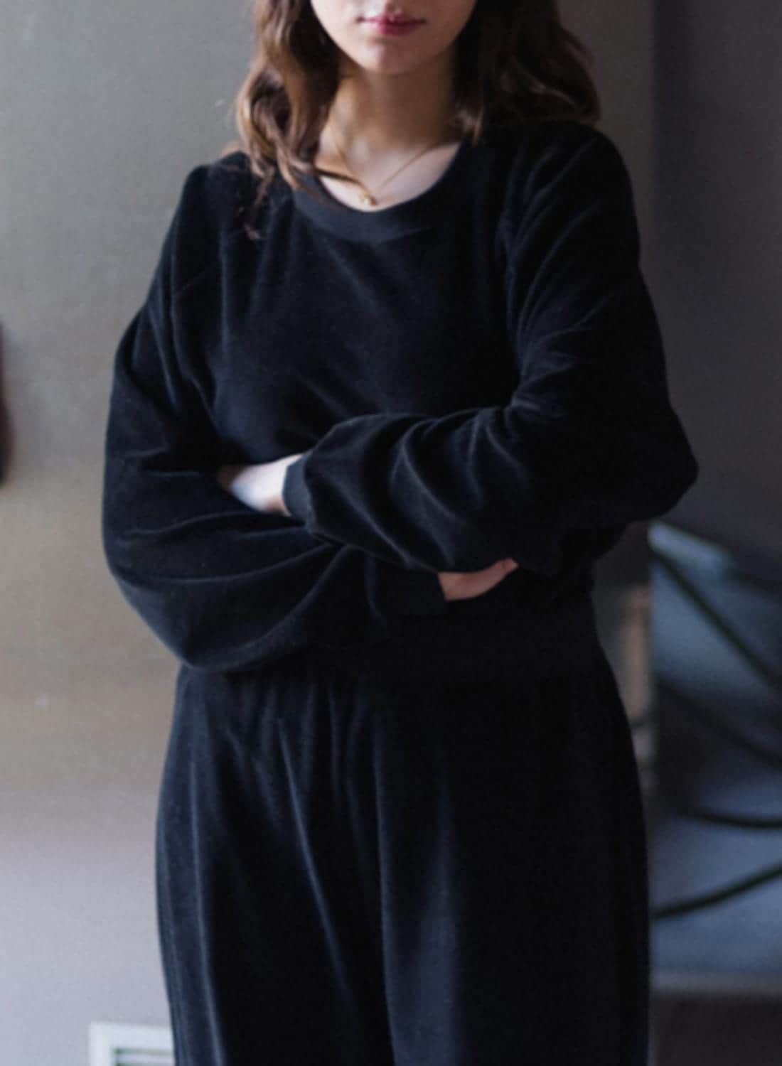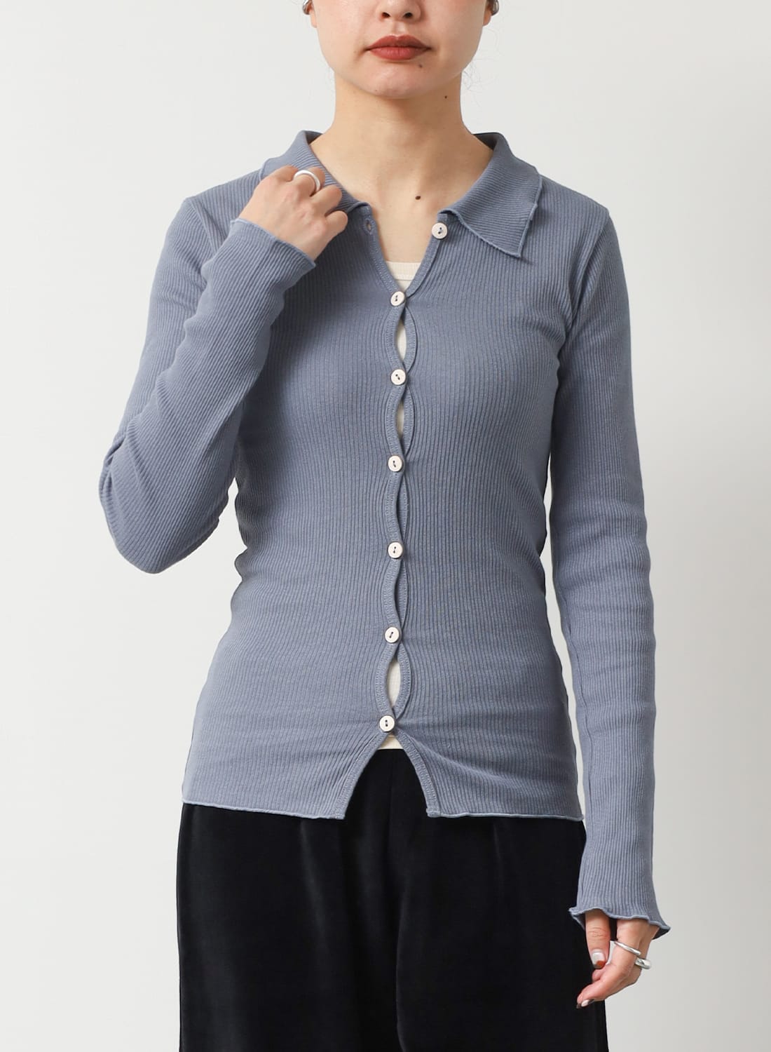 コットン カシミヤ リブ タイト クルー ネック ロングスリーブ Tシャツ