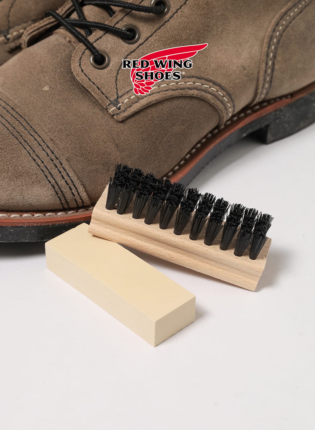 レッドウィングのラフアウトモデルをはじめ、起毛レザーの自然な風合いを気持ちよく保ちたい人におすすめの扱いやすいケアセットだ。
