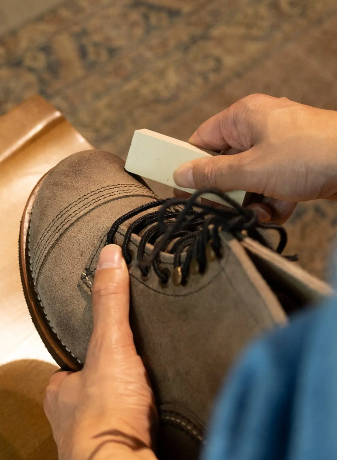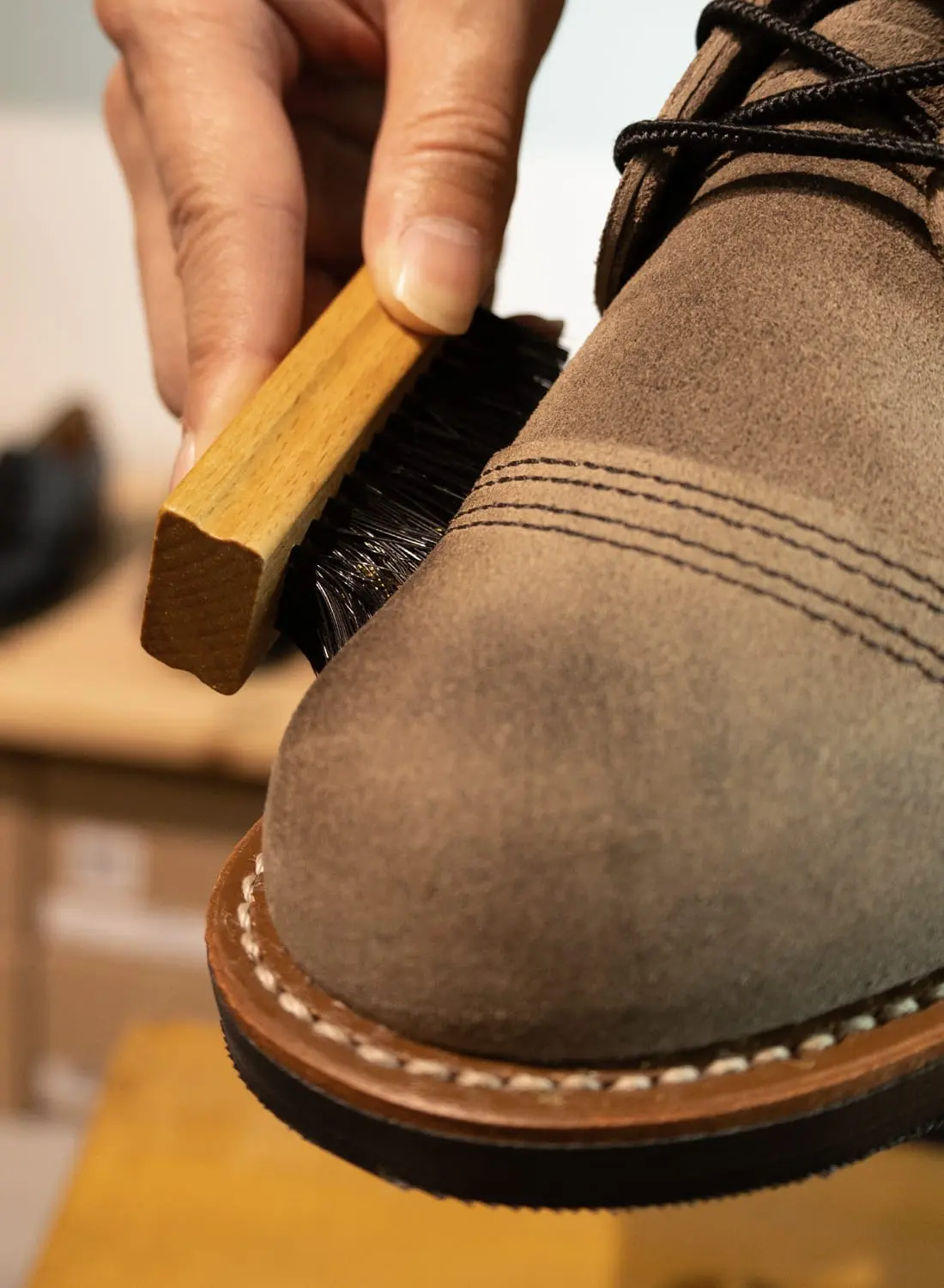 仕上げにもう一度ブラシを当て、今度は毛並みを自然な方向へ戻すように整えていくと、起毛革らしいふんわりとした質感がきれいに甦る。