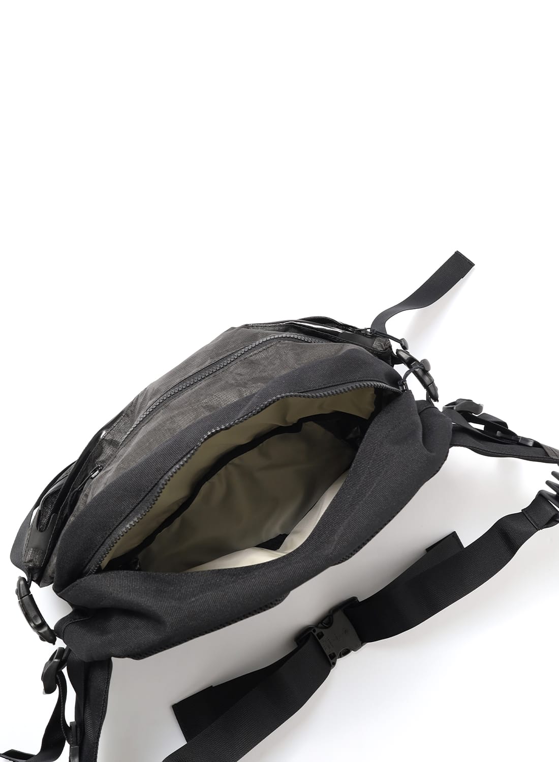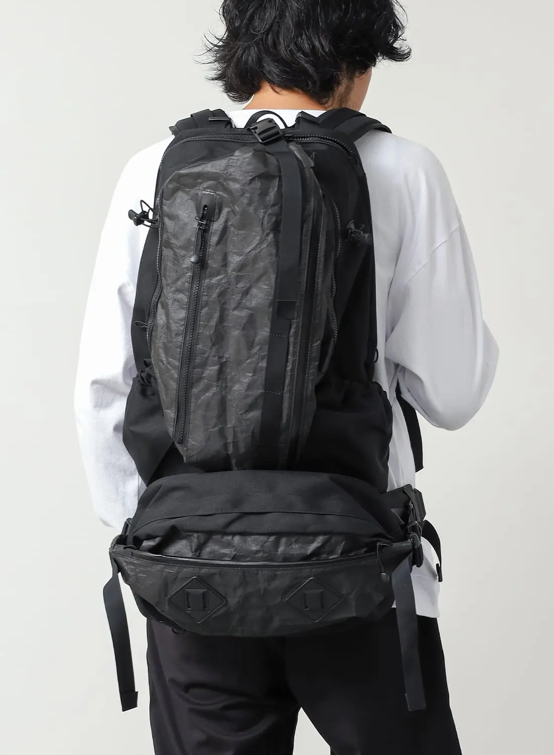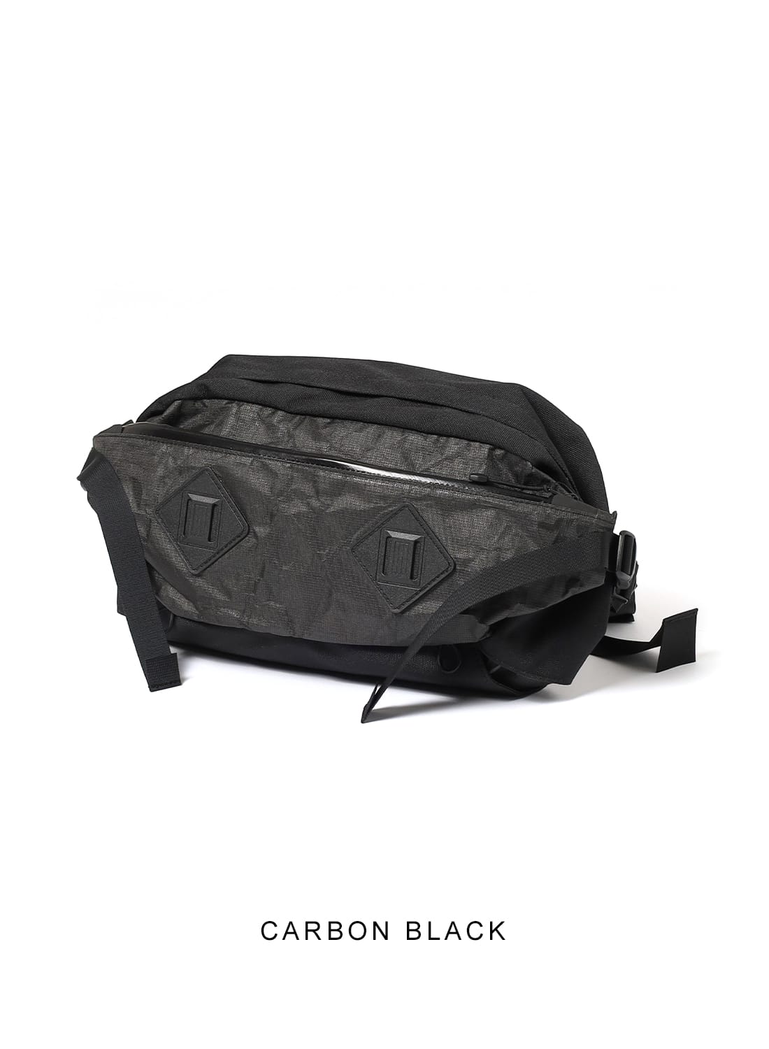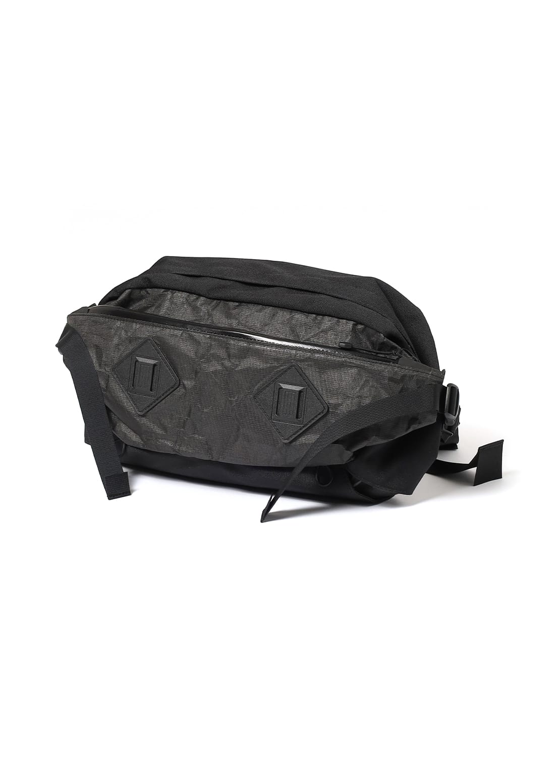 フロントには2つのコンプレッションポケットを備え、左右のテープを引けば荷物を体側にしっかりと寄せられるため、動きのある場面でも安定感を保つ。メインコンパートメントには小物用ポケットも備え、整理性も十分。左右のV字テープはフィット感の調整だけでなく、バックパックにドッキングする際のコネクト部分として機能する。