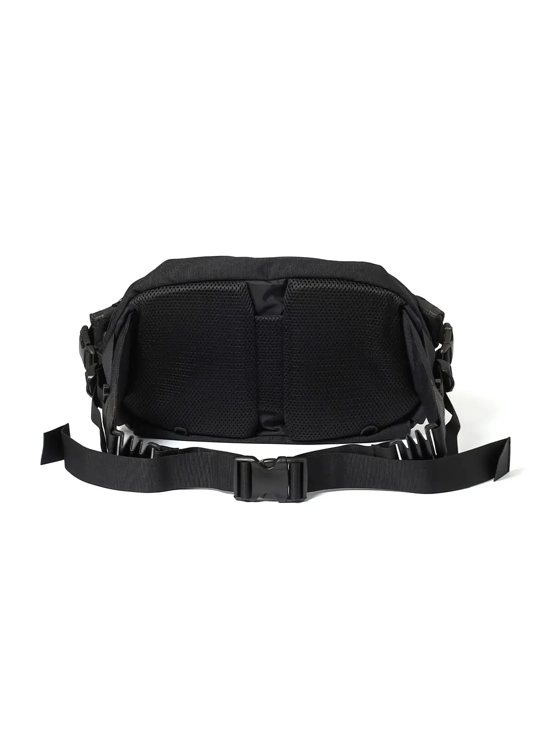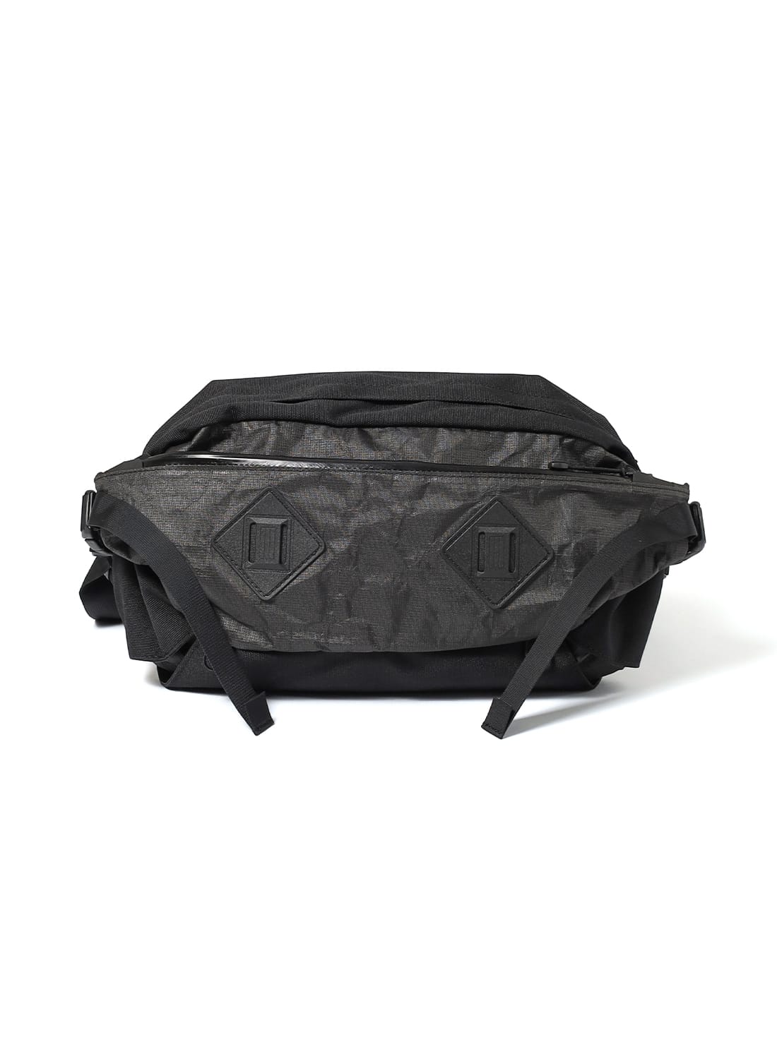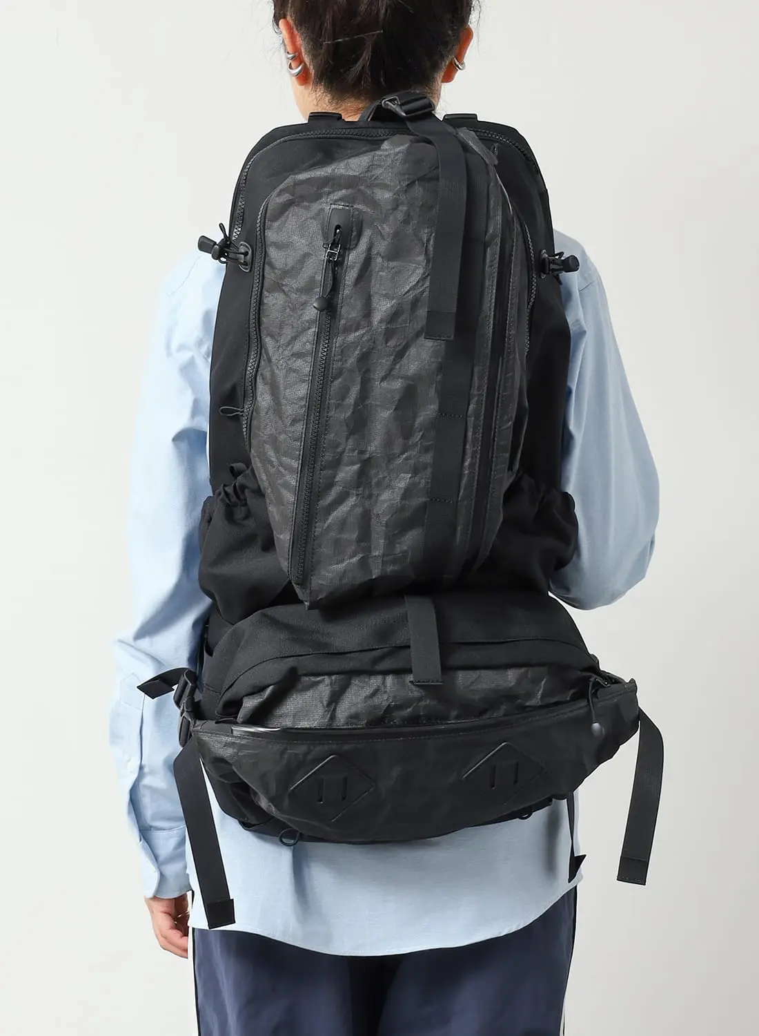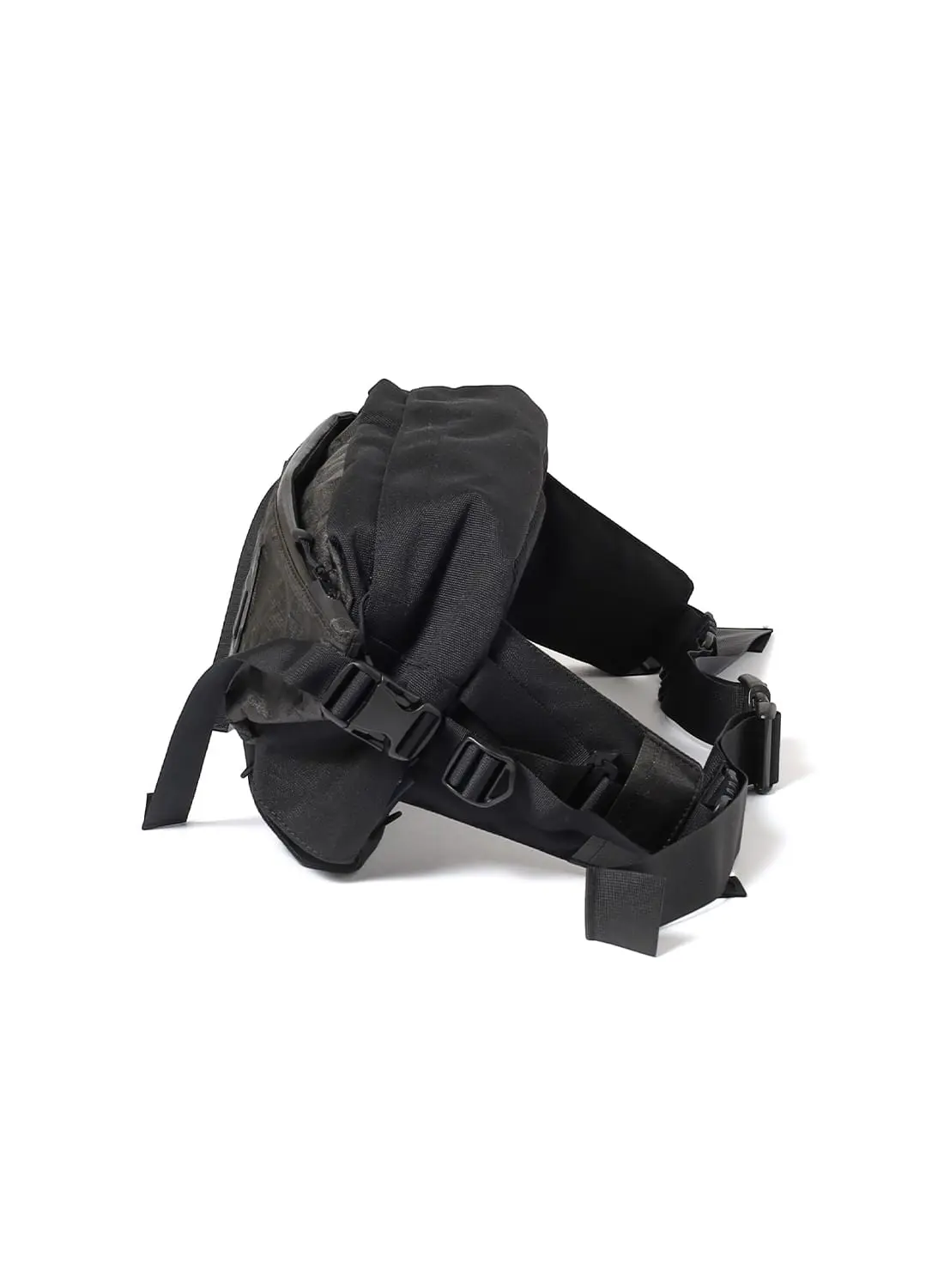 フロントには2つのコンプレッションポケットを備え、左右のテープを引けば荷物を体側にしっかりと寄せられるため、動きのある場面でも安定感を保つ。メインコンパートメントには小物用ポケットも備え、整理性も十分。左右のV字テープはフィット感の調整だけでなく、バックパックにドッキングする際のコネクト部分として機能する。
