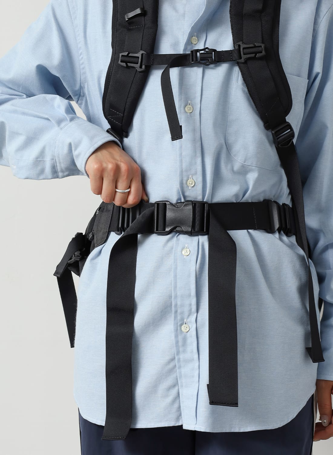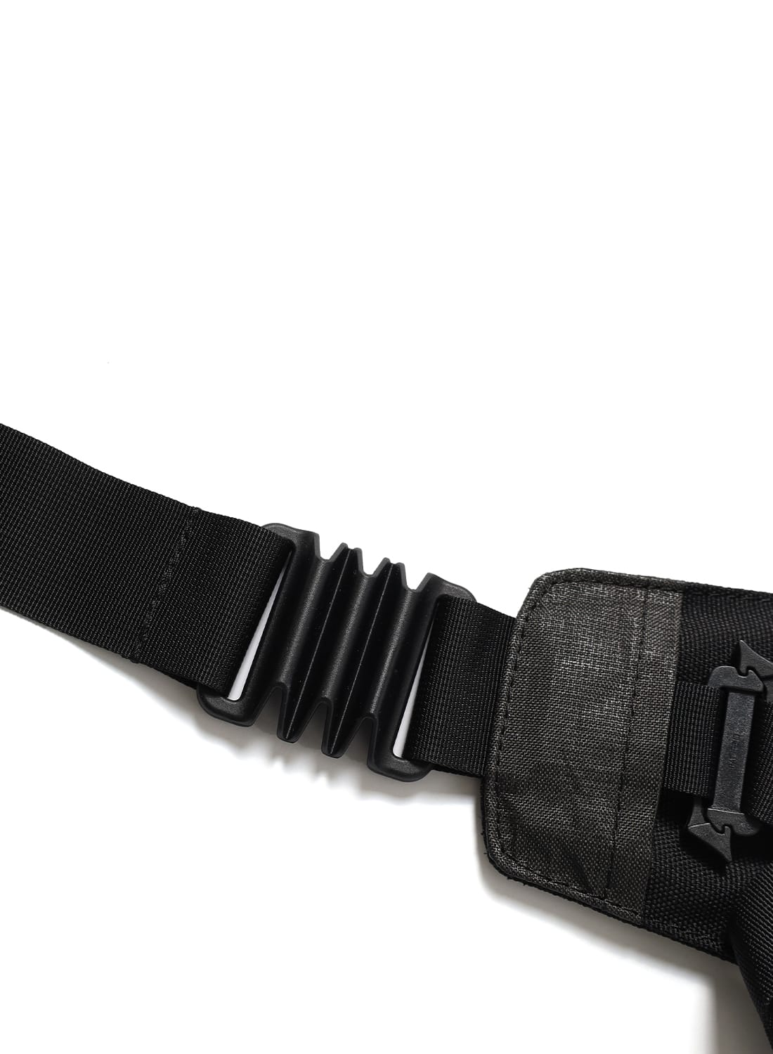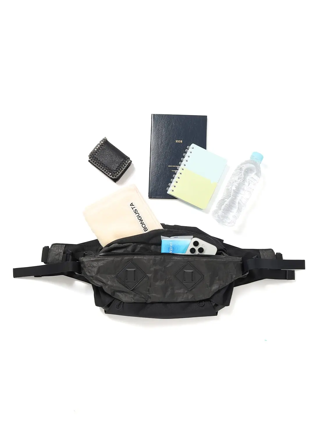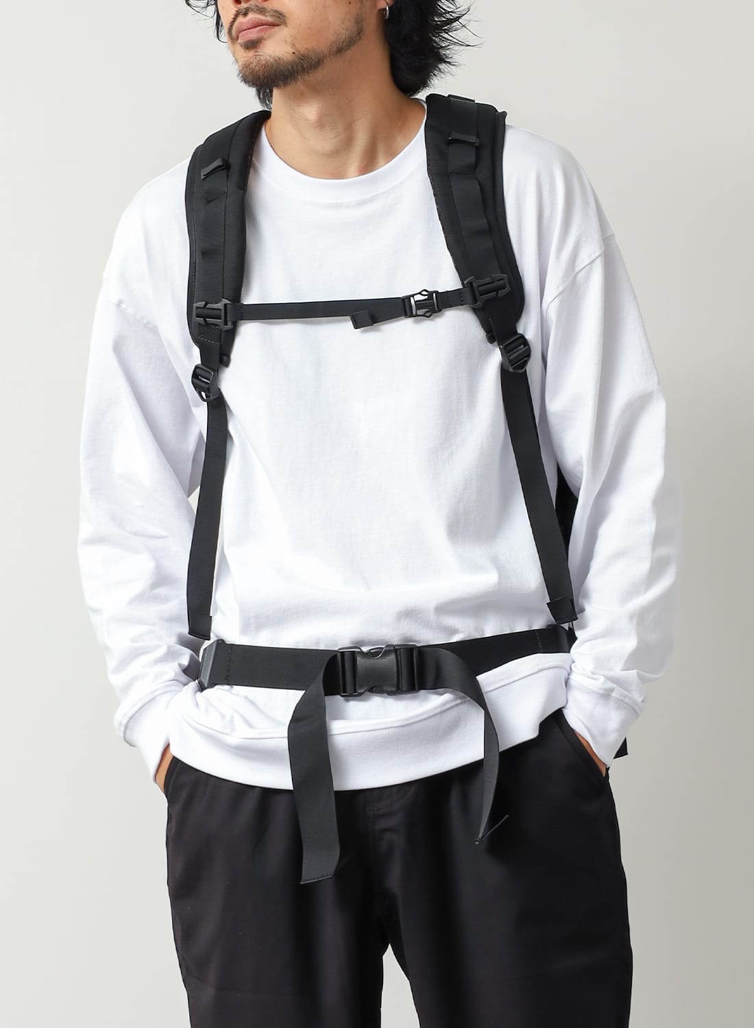 フロントには2つのコンプレッションポケットを備え、左右のテープを引けば荷物を体側にしっかりと寄せられるため、動きのある場面でも安定感を保つ。メインコンパートメントには小物用ポケットも備え、整理性も十分。左右のV字テープはフィット感の調整だけでなく、バックパックにドッキングする際のコネクト部分として機能する。