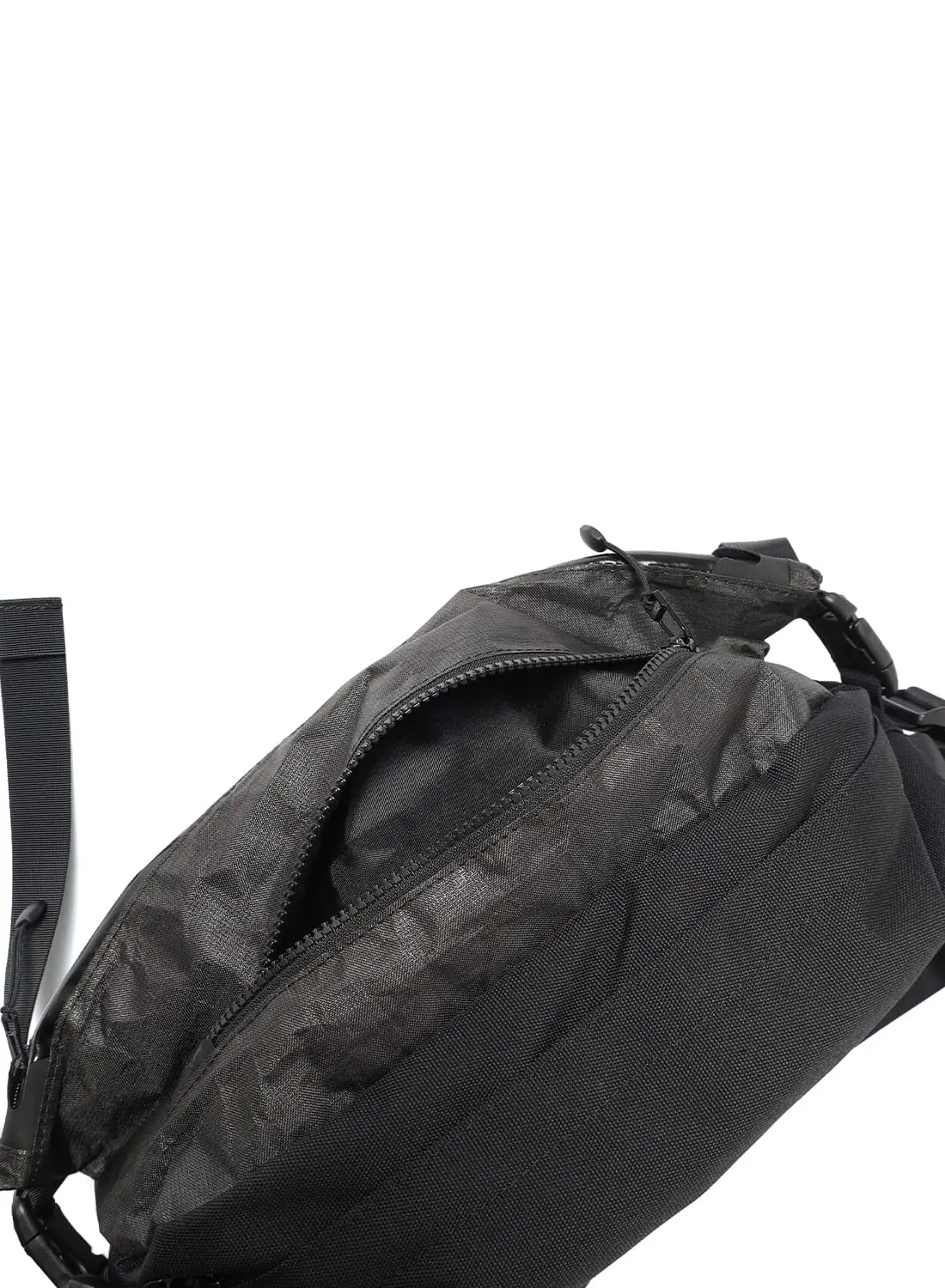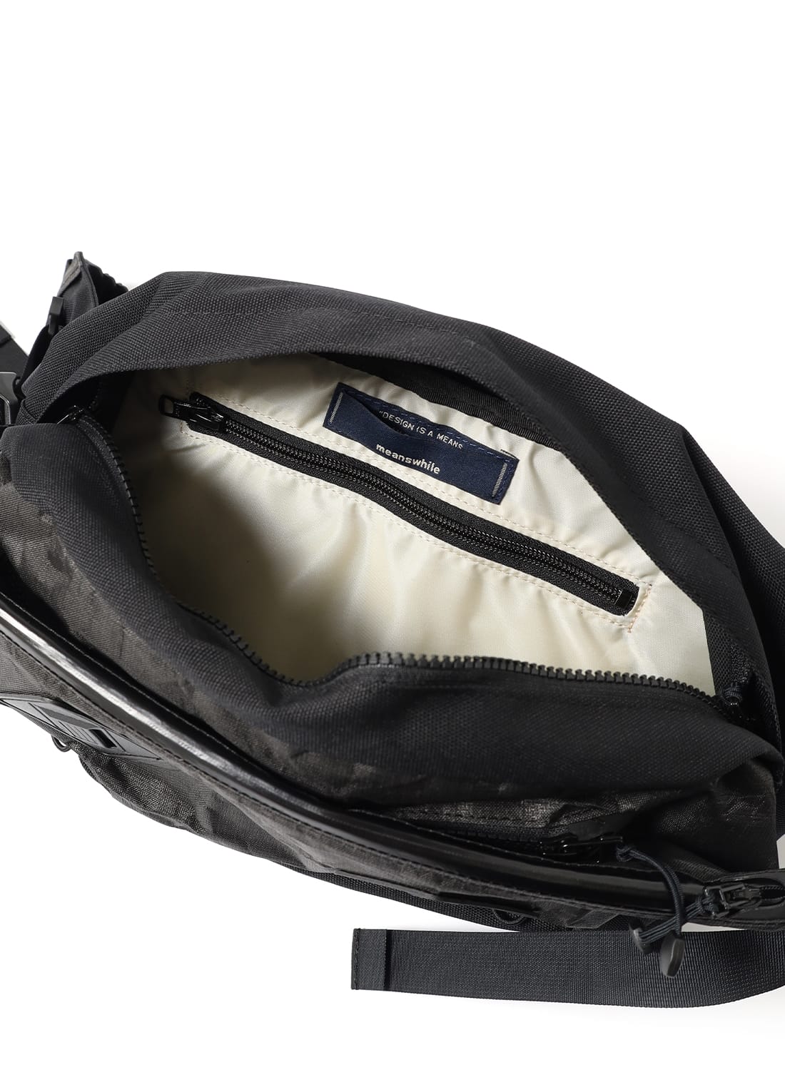 meanswhileでは、このUltraWeaveを用途に応じて適材適所で使い分けている。ボディには摩擦に強いタイプを、フロントには防水性と引き裂き強度に優れたタイプを配置。軽さ・強靭さ・耐久性を高次元でバランスさせ、日常からフィールドまでシームレスに使えるバッグへと昇華させている。