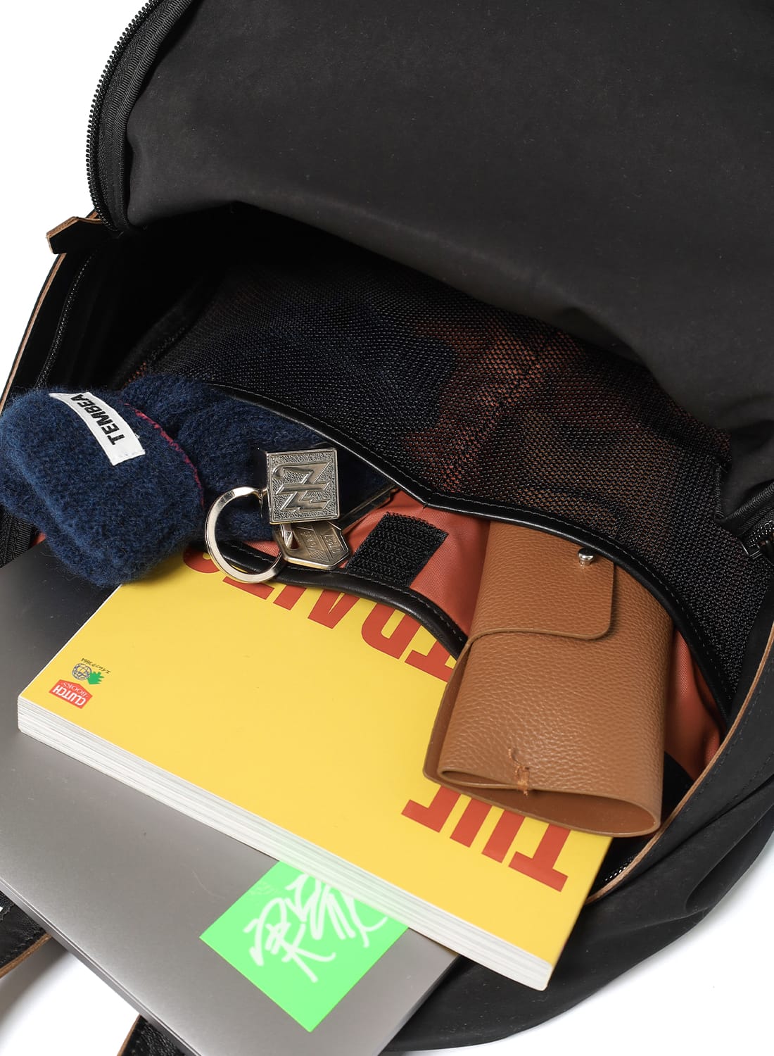 背面にはPCスリーブと小物用のメッシュ仕切りを備え、荷物を効率よく整理できる構造。