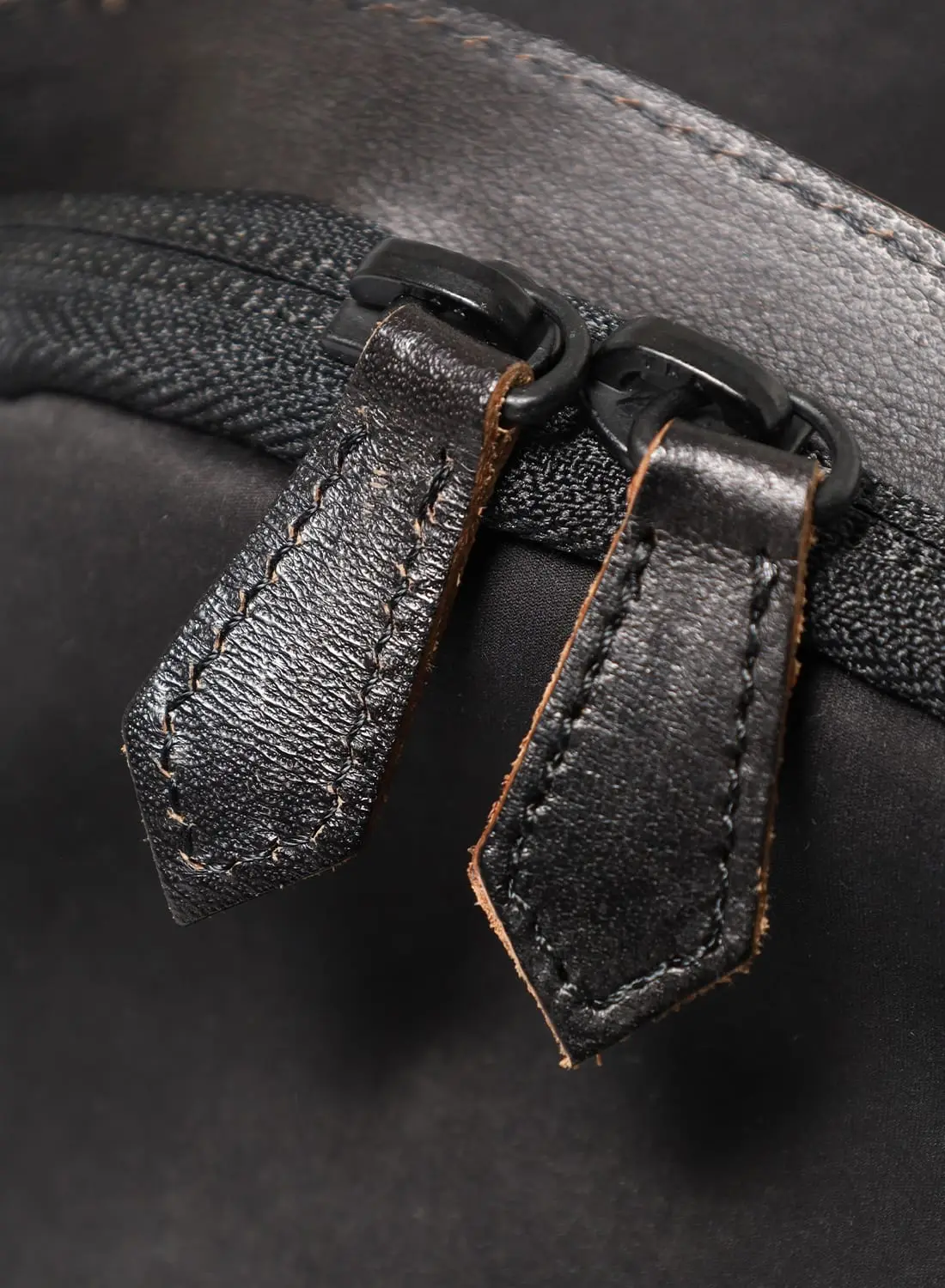 ダブルジップの引き手にもレザーを用い、使うほどに手に馴染む。