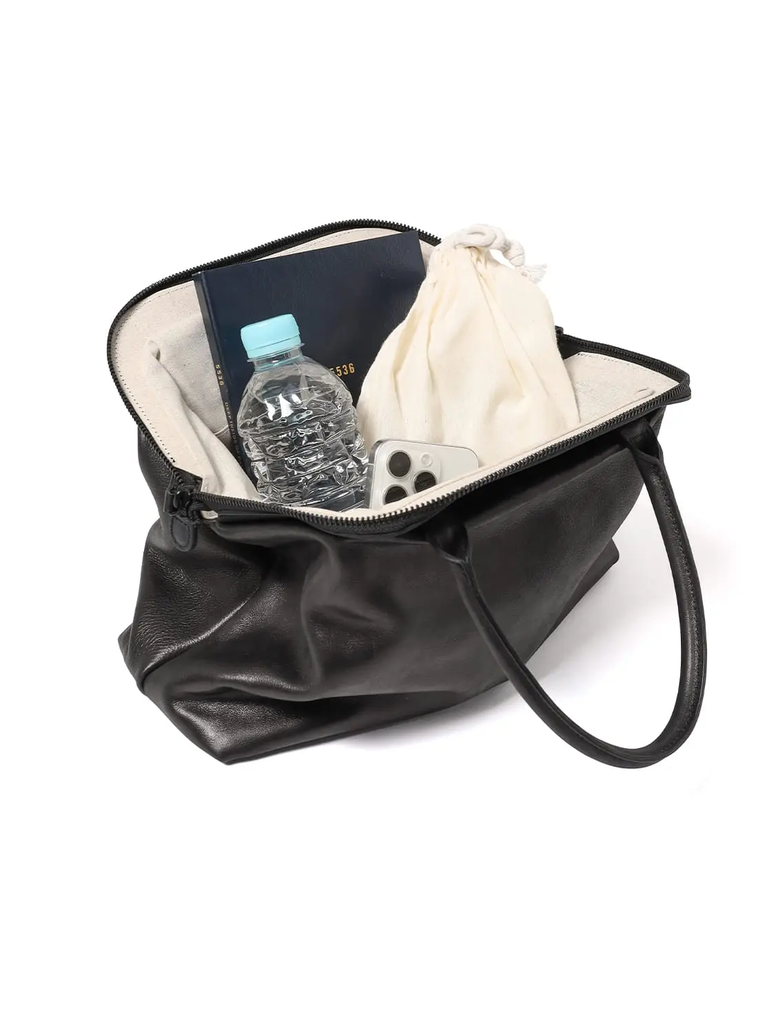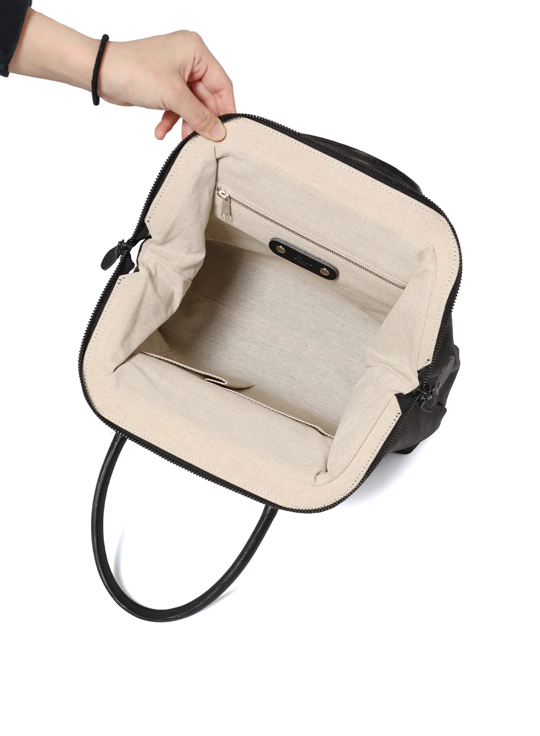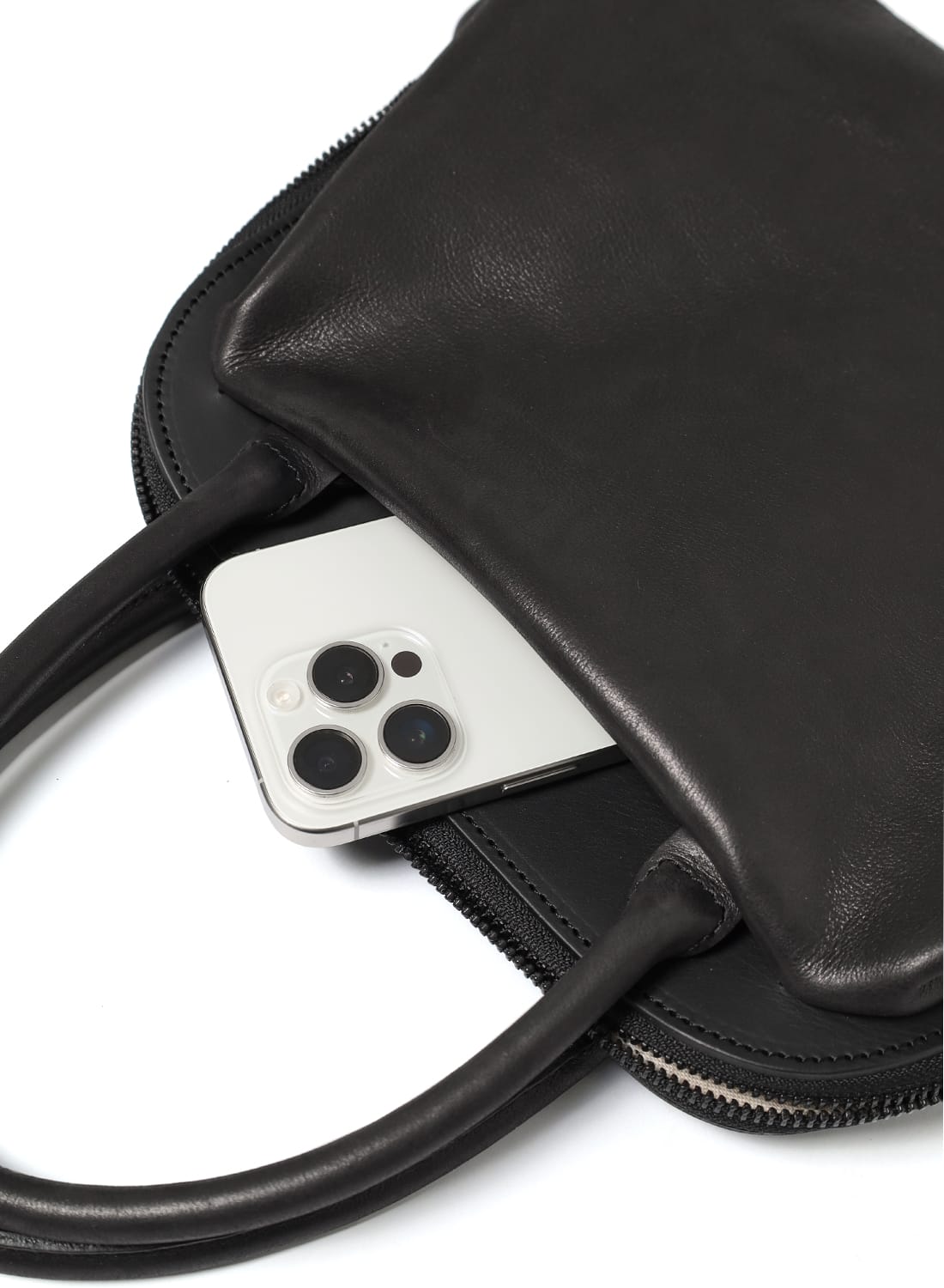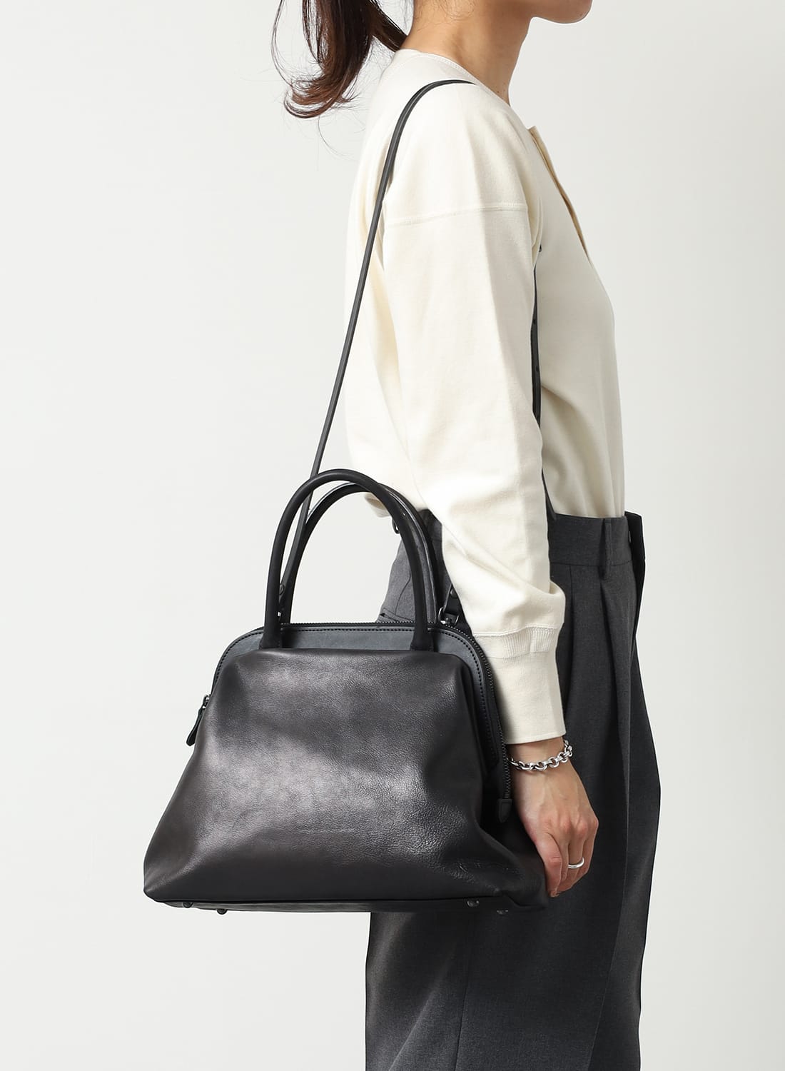 デザインに巧みに溶け込ませることで、小物の収納はもちろん、ショルダーバッグとして使用する際に持ち手をすっきり収めることができます。