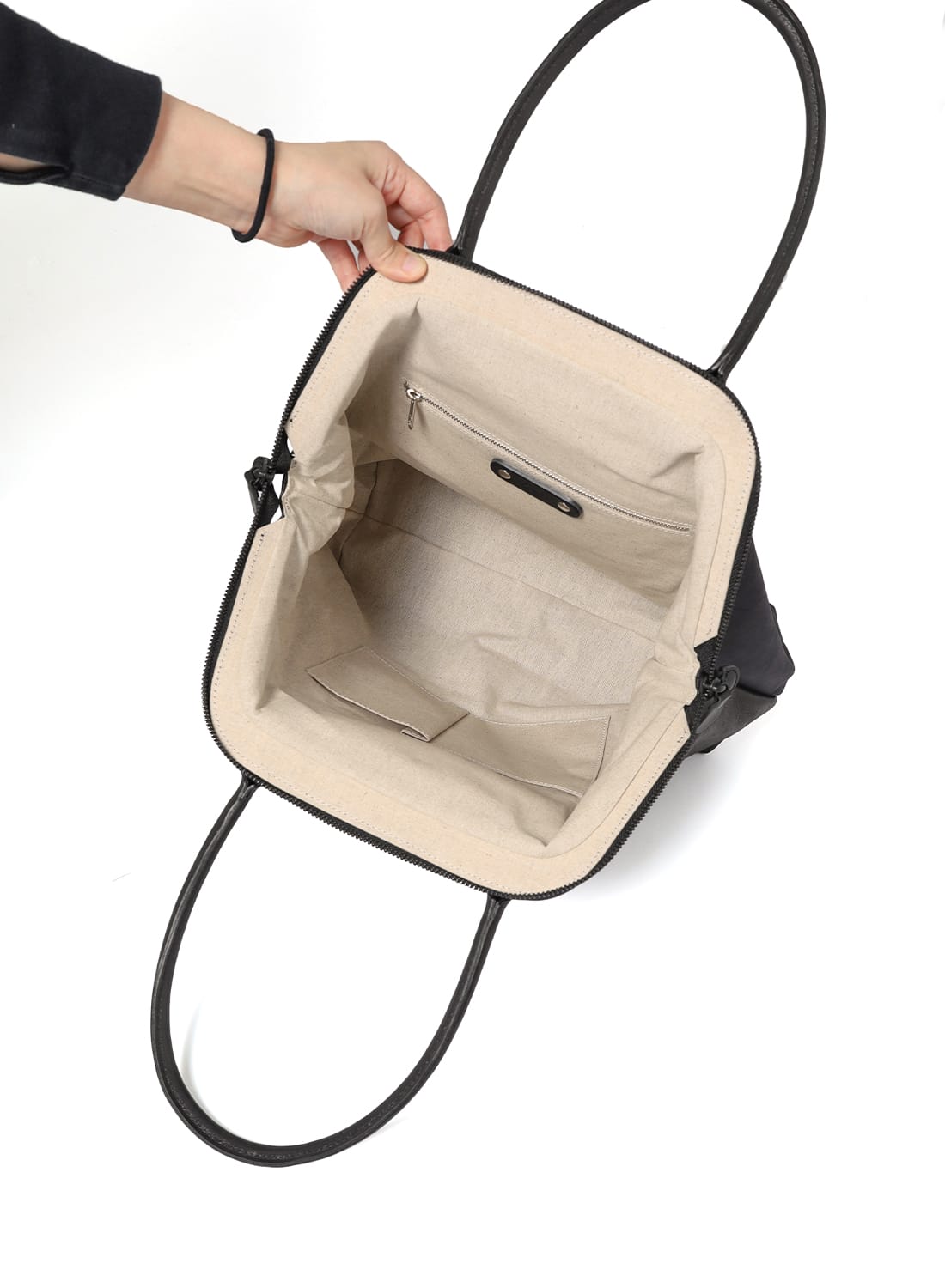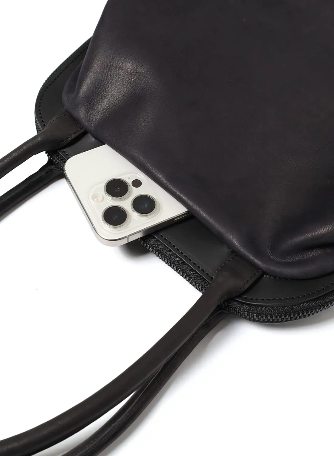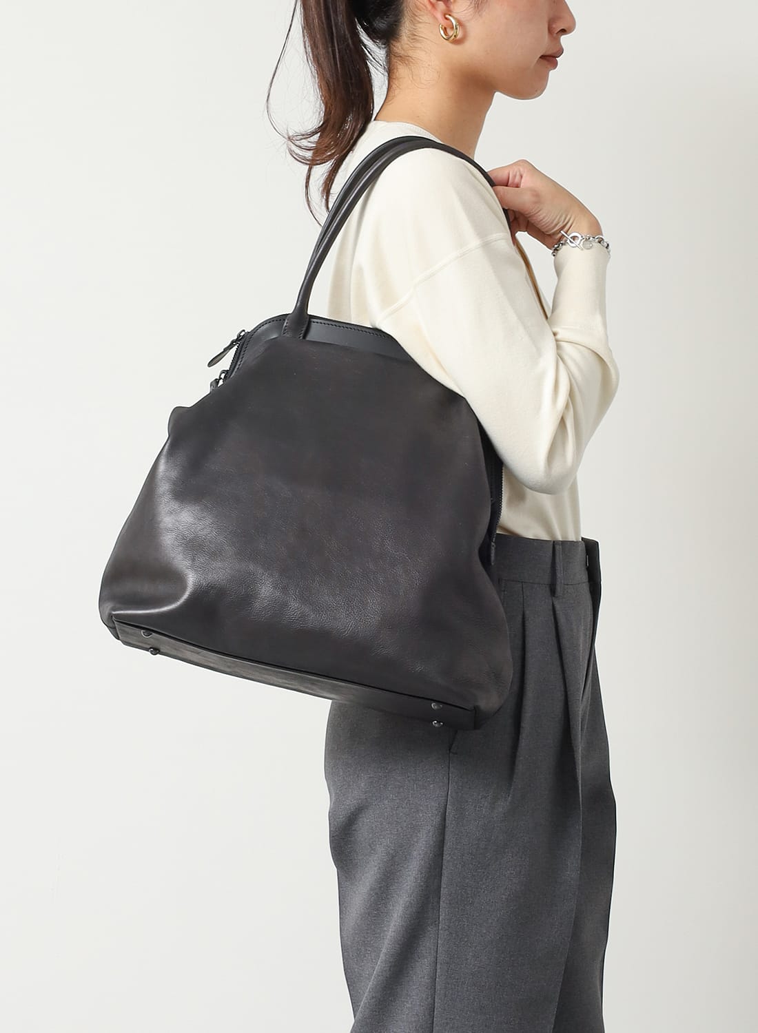 がま口のような佇まいと、レザートートの機能性を兼ね備えた一品。