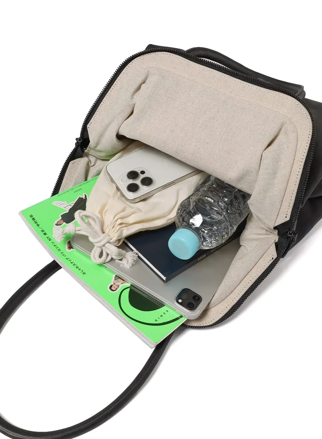 A4サイズが縦にすっぽり収まる収納力に加え、ファスナーを開けると中身が大きく見渡せる構造。