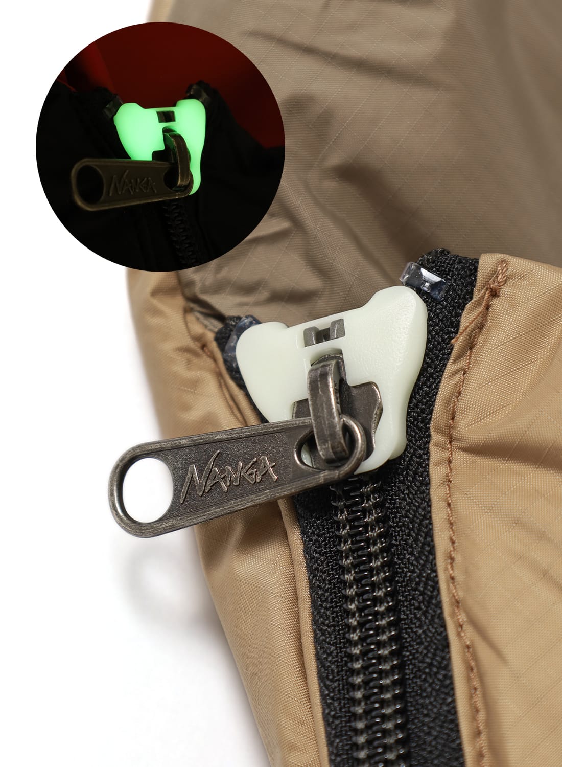 ジッパーには蓄光パーツが備わっており、暗いテント内でも引き手の位置がひと目で分かる。
