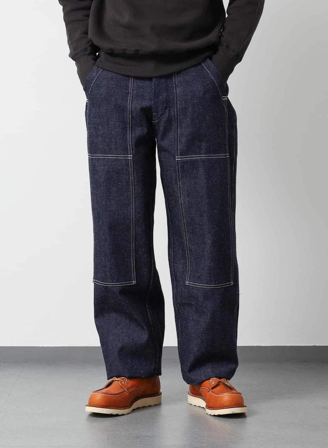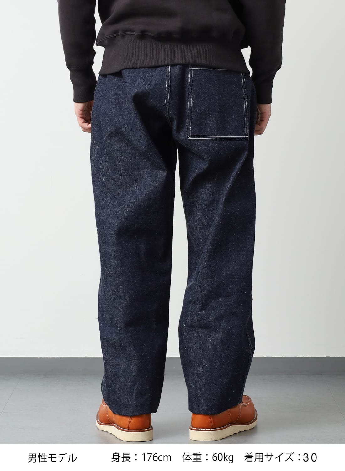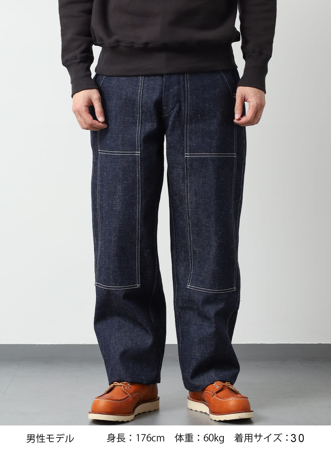 ダブルニー仕様による膝周りの補強、立体的に仕上げられたヒップライン、セルヴィッチ部分をそのまま使用したベルトループなど当時の実物に見られるディテールを踏襲している。